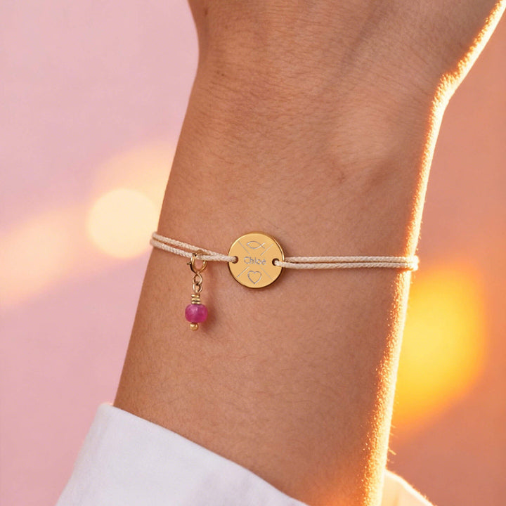 Créez un bracelet aussi unique que l'histoire qu'il raconte. Ce bracelet cordon personnalisé réunit votre pierre de naissance et votre médaille gravée pour en faire un bijou délicat, lumineux et plein de sens, à porter chaque jour comme un porte‑bonheur discret.