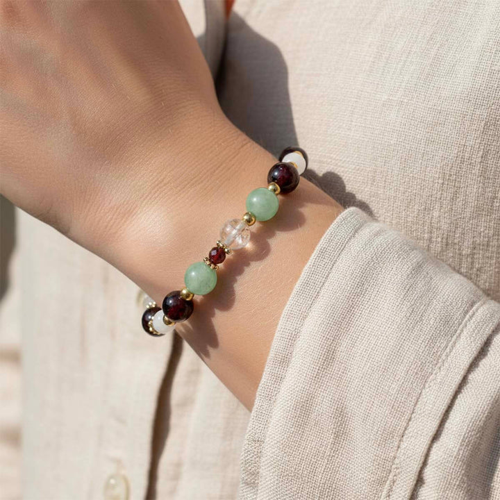 La vraie chance ne consiste pas à détenir la meilleure des cartes à la table ; le plus chanceux est celui qui sait juste quand se lever et rentrer chez lui. Oubliez les porte-bonheur, Bracelet de prospérité vigoureuse est tout ce dont vous avez besoin pour vous assurer que les chances sont toujours en votre faveur ! Avec une mentalité de «planification à l'avance» inspirée par la signification de l'aventurine verte, vous serez sur la voie d'un succès débordant. Cela aide également à atténuer le doute de soi ou les croyances auto-limitatives qui peuvent accompagner un état d'esprit négatif. Si vous manquez d'énergie ou si vous vous sentez paresseux et déconnecté du moment présent, la pierre de grenat enlèvera vos peurs, vos soucis et vos angoisses tout en vous transformant en un être humain fort, créatif et enthousiaste. La signification du cristal de quartz fantôme vous permet de voir votre chemin et de le vivre pleinement, lorsque vous n'êtes pas sûr, incertain ou hésitant, il n'y a pas de meilleur cristal pour vous aider à retrouver la vie que vous voulez pour vous-même. Les pierres de jade blanc transformeront votre point de vue en un état d'esprit très optimiste et abondant, qui est le précurseur nécessaire au succès. Ce bracelet a été spécialement conçu pour vous aider à apporter prospérité et abondance à votre vie.