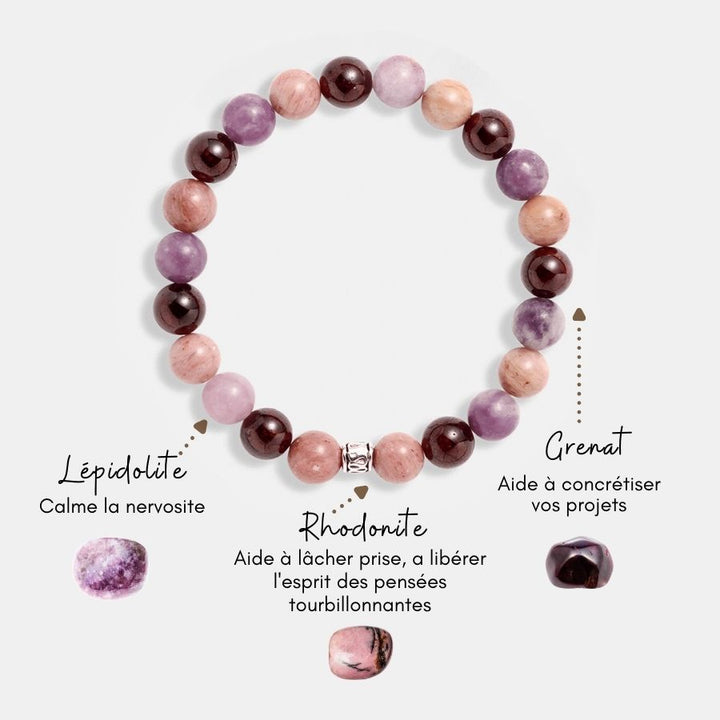 - Pierres : Lépidolite, Rhodonite, Grenat