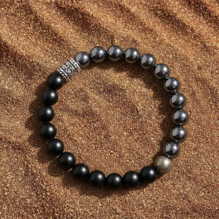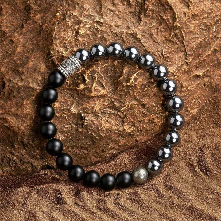 Ce qui se cache derrière nous et ce qui se profile à l'horizon sont des détails insignifiants comparés à la force que nous portons en nous. Découvrir votre véritable force intérieure nécessite de la résilience et du courage – des vertus incarnées par notre bracelet soigneusement conçu, orné de puissantes pierres d'Onyx Noir, d'Hématite et de Pyrite.
