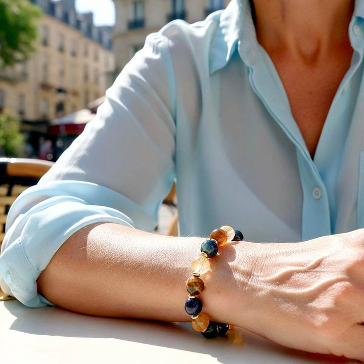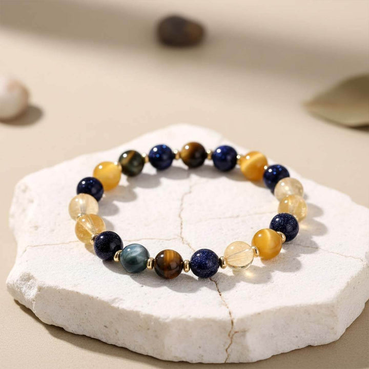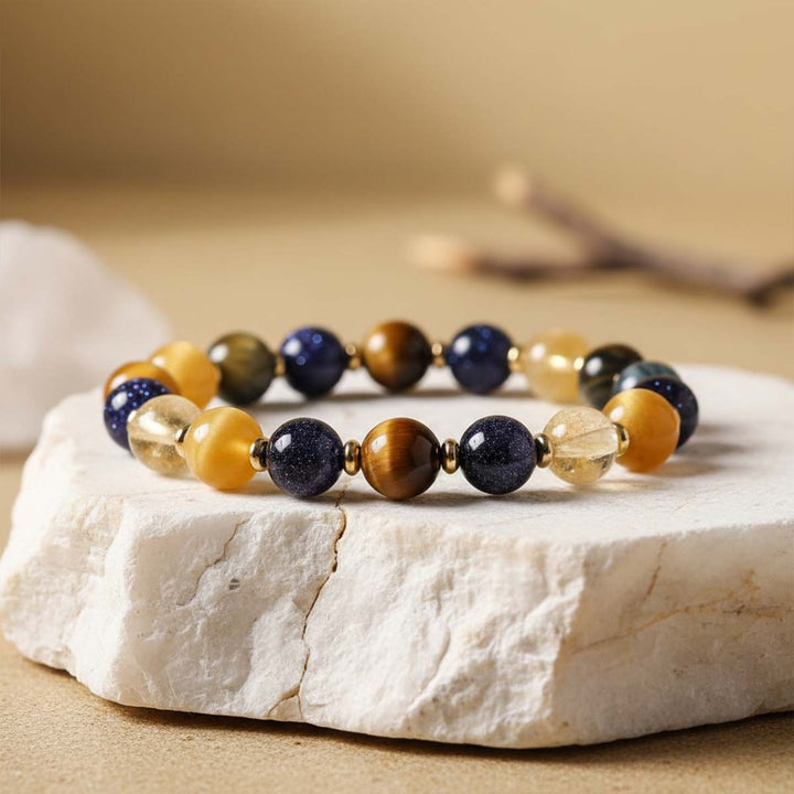 Le bracelet "Libérez Votre Potentiel" combine la puissance de l'œil de tigre, de la citrine, de la Pierre Goldstone et de l'œil de faucon pour vous aider à débloquer votre plein potentiel, à réaliser vos rêves les plus chers et à vivre une vie épanouissante.