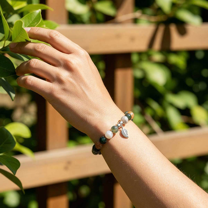 Découvrez une nouvelle dimension de votre vie avec le bracelet "Nouvelle Feuille" mettant en vedette des perles d'agate feuille de bambou et d'agate mousse. Laissez les énergies de ces pierres précieuses vous inspirer à adopter le changement, raviver votre passion et favoriser votre croissance personnelle.
