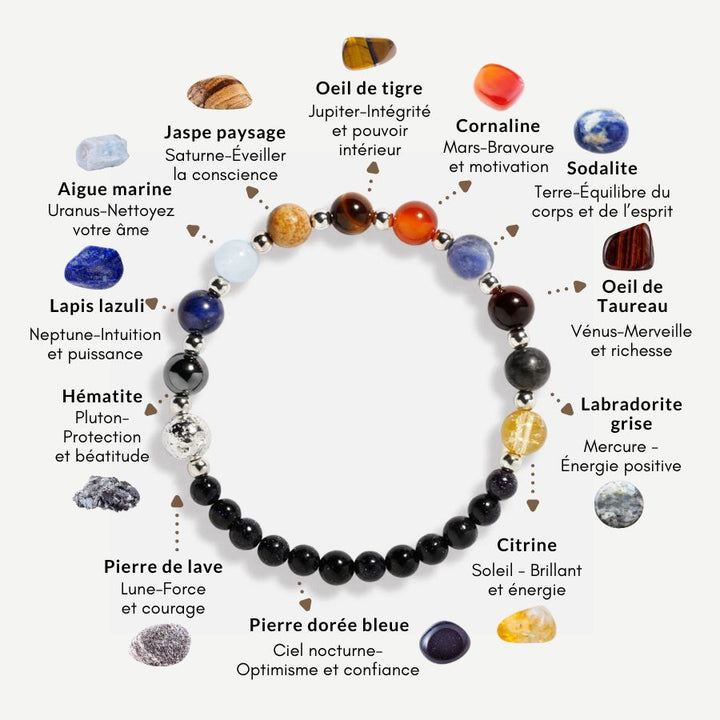 Le Bracelet Planète en Pierre précieuse déborde de charme cosmique. Chaque pierre correspond à l'énergie de la planète à laquelle elle est associée, transformant votre espace aurique en un univers de possibilités. Lorsque nous travaillons en accord avec le monde qui nous entoure et les énergies qui dépassent notre terre, nous pouvons illuminer nos propres systèmes solaires internes et briller.