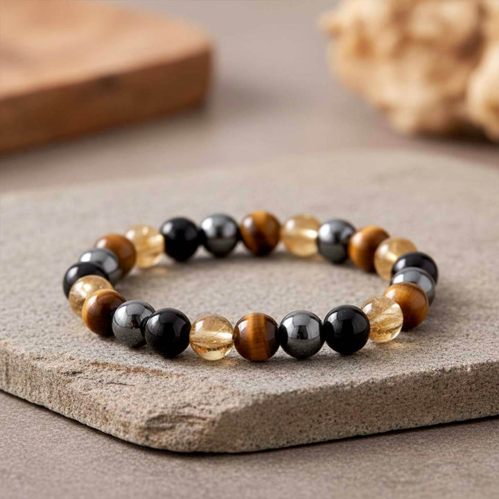 Laissez-vous envelopper par l’énergie combinée de l’Hématite, de l’Obsidienne noire, de l’Œil de Tigre et de la Citrine.