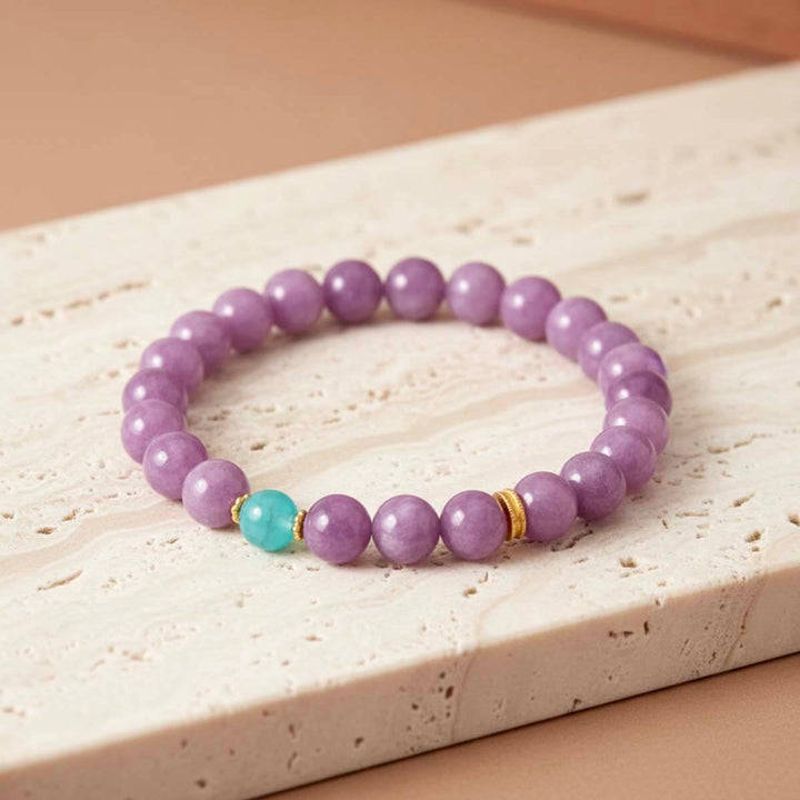 Au cœur de ce bracelet vibre la Lépidolite, pierre de l'apaisement et du renouveau. Ses nuances délicates de violet, telle une brise légère sur les champs de lavande, ont le pouvoir d'apaiser les émotions tumultueuses, vous enveloppant d'un voile de sérénité. Telle une amie bienveillante, elle vous guide vers une harmonie intérieure, transformant le chaos en une douce mélodie.Associée à l'Amazonite, cette gemme aux reflets turquoise aussi limpides que les eaux de la Seine agit comme un bouclier protecteur, repoussant les énergies négatives et favorisant une communication authentique et sincère.